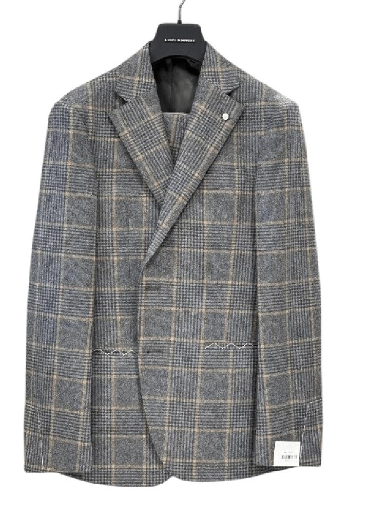 Abito sartoriale Principe di Galles in flanella cardata grigia con riga beige.