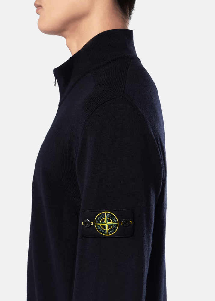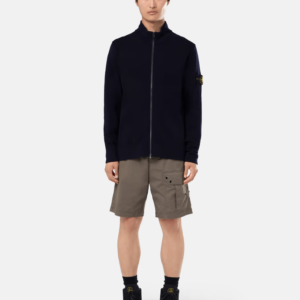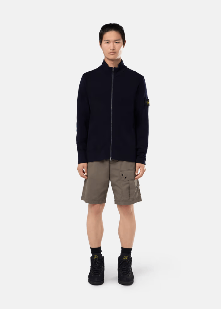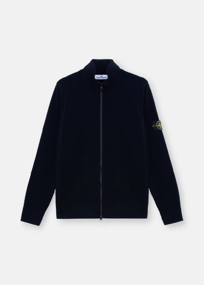 Cardigan in lana elasticizzata certificata RWS. Maglia rasata. Finezza 12. Il Responsible Wool Standard (RWS) descrive e certifica il benessere degli animali e le pratiche di gestione del territorio nella produzione della lana, tenendo traccia del materiale certificato dall’allevamento al prodotto finale.