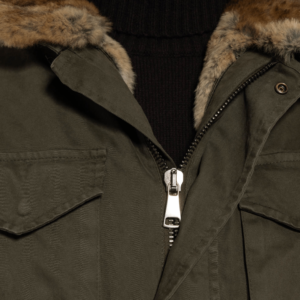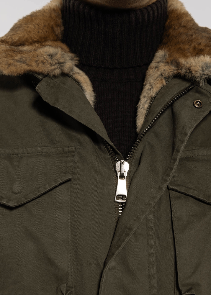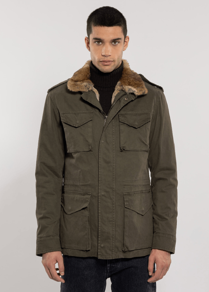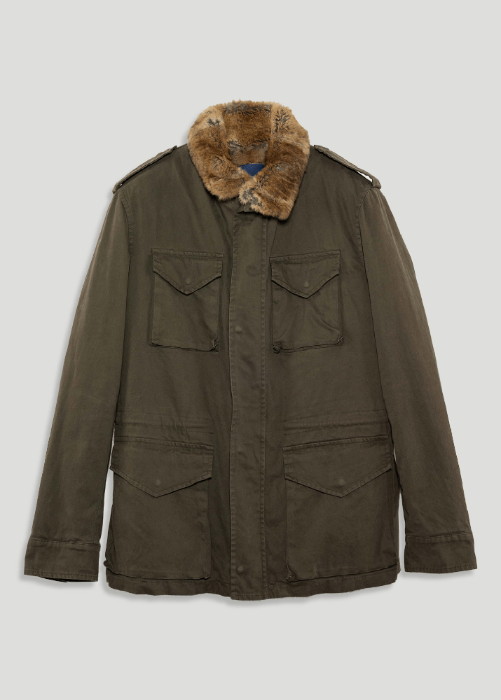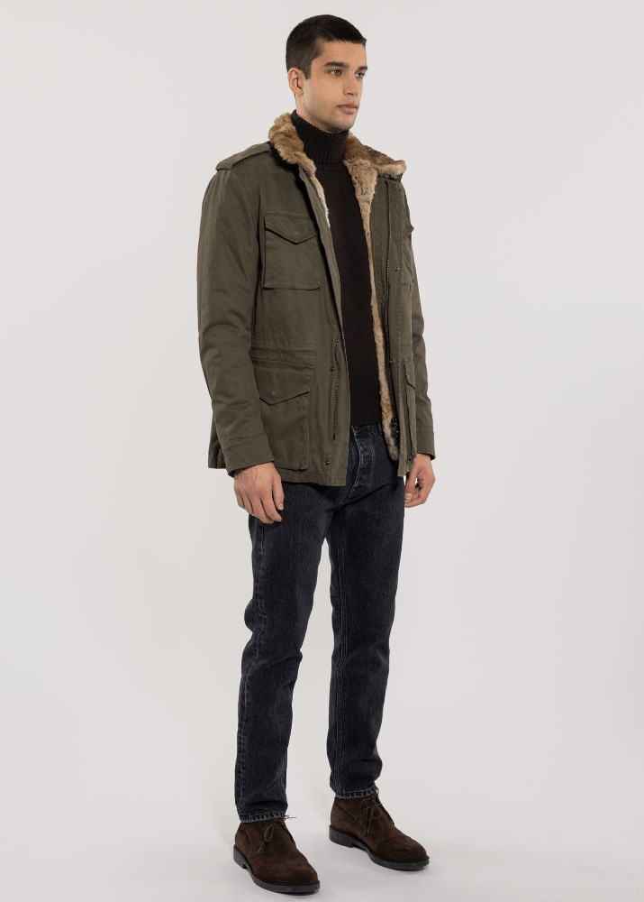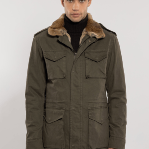 Field jacket in cotone invernale. La  fodera di vera pelliccia amovibile ne consente l’utilizzo nell’arco di almeno tre stagioni durante l’anno.