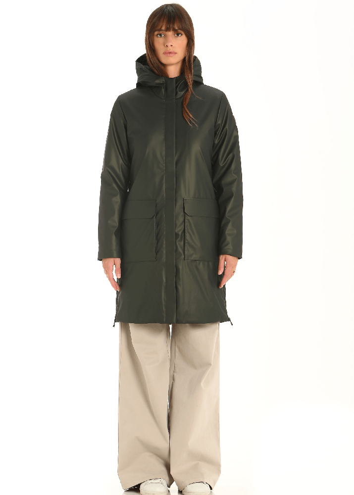 Giacca Lunga Rain con cappuccio. La spalmatura esterna in poliuretano e la zip esterna stagna rendono il capo totalmente impermeabile e resistente al vento. Imbottitura in morbido sherpa abbinata al colore esterno.