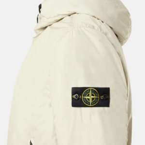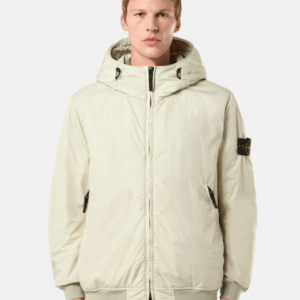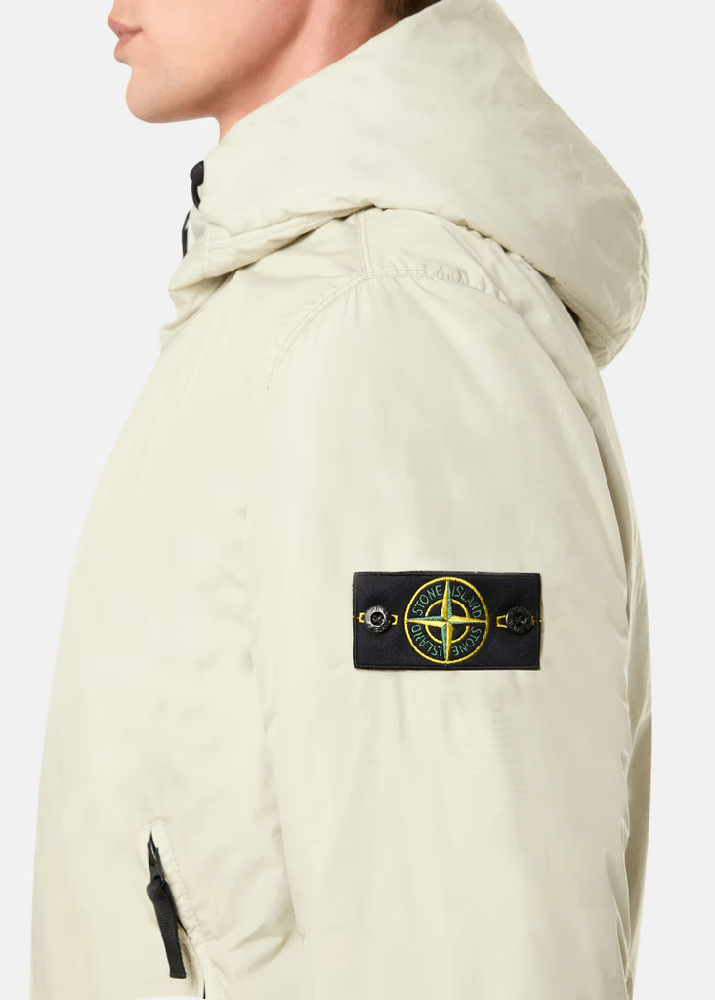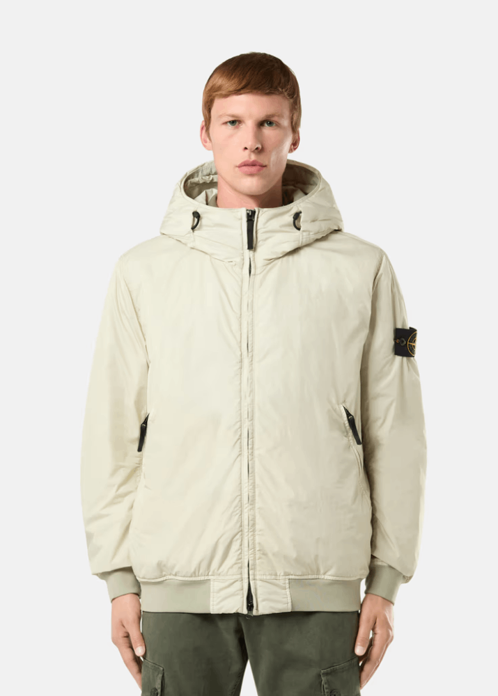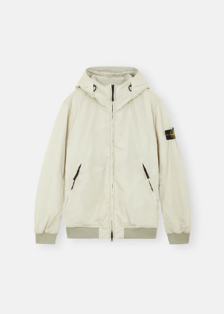 Blouson con cappuccio realizzato in reps di nylon leggero riciclato al 100% con una costruzione a tessitura ultra-stretta. Il rivestimento in resina del lato interno lo rende anti vento e parzialmente idrorepellente. Il capo è imbottito con uno strato di PrimaLoft®-TC, un’esclusiva miscela di fibre isolanti riciclate al 70%, studiata insieme a Stone Island per resistere alle alte temperature delle procedure di tintura senza compromettere il tessuto o le sue proprietà isolanti. Con la resinatura del materiale, il colore penetra in modo non uniforme nel tessuto, conferendo un aspetto increspato alla superficie. L’aggiunta di uno speciale agente privo di PFC alla formula del colorante rende il capo antigoccia.