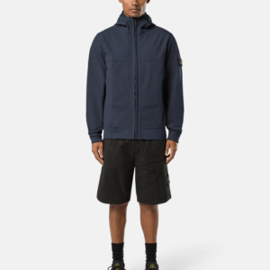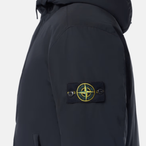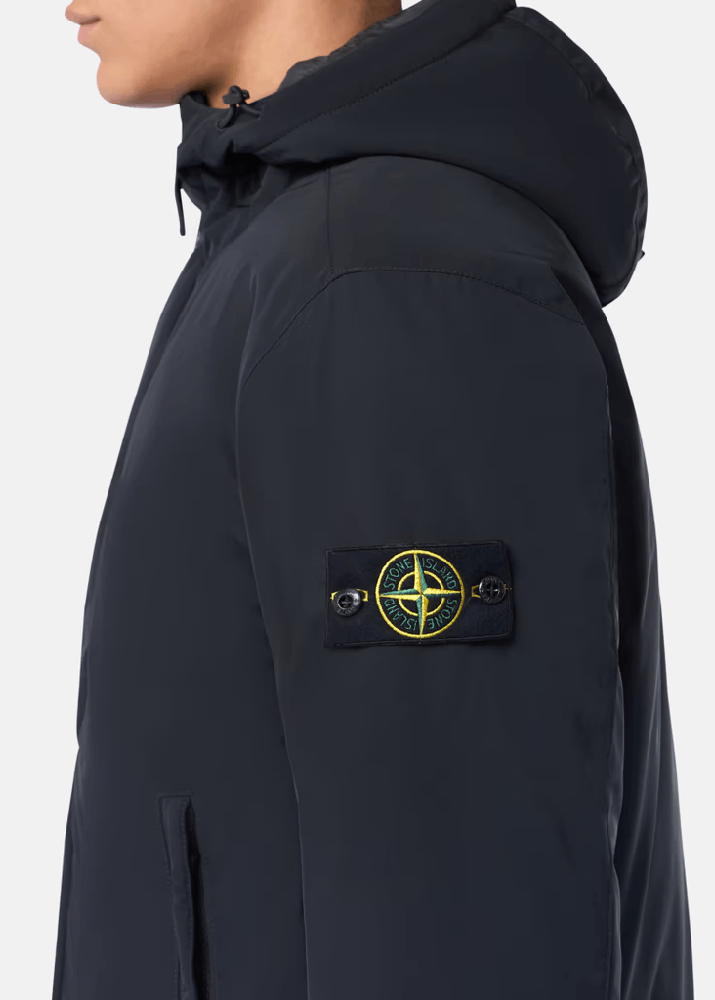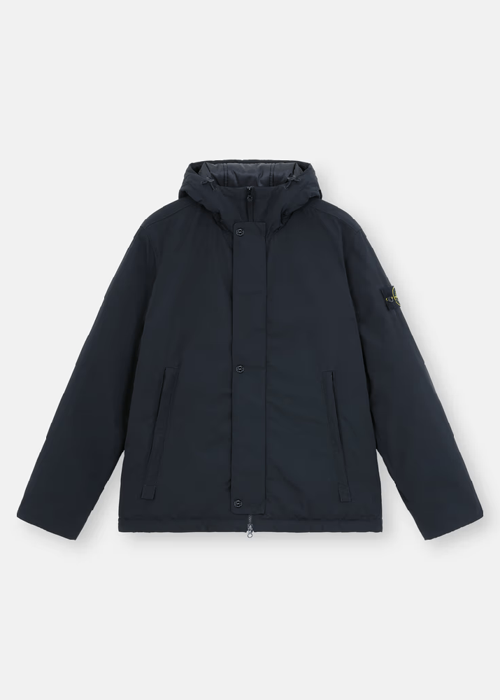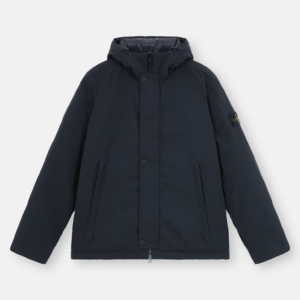 Giacca con cappuccio leggera in materiale performante a 3 strati con una capacità di colonna d’acqua pari a 8000 MM. Il lato esterno in tela elasticizzata di poliestere riciclato al 100% è tessuto con filati che utilizzano la tecnologia e.dye® Waterless Color System™, l’innovativo sistema di saturazione del colore del filato che permette di ridurre dell’85% l’uso di acqua e del 90% i prodotti chimici impiegati nel processo di tintura. Il tessuto è stratificato su una membrana interna traspirante, resistente al vento e all’acqua, protetta da un supporto in pile di poliestere. La struttura esterna del materiale conferisce grande flessibilità e comfort all’indumento.