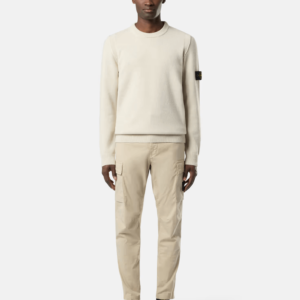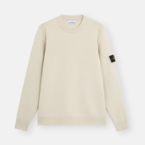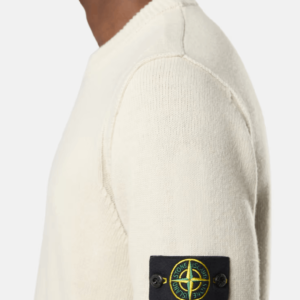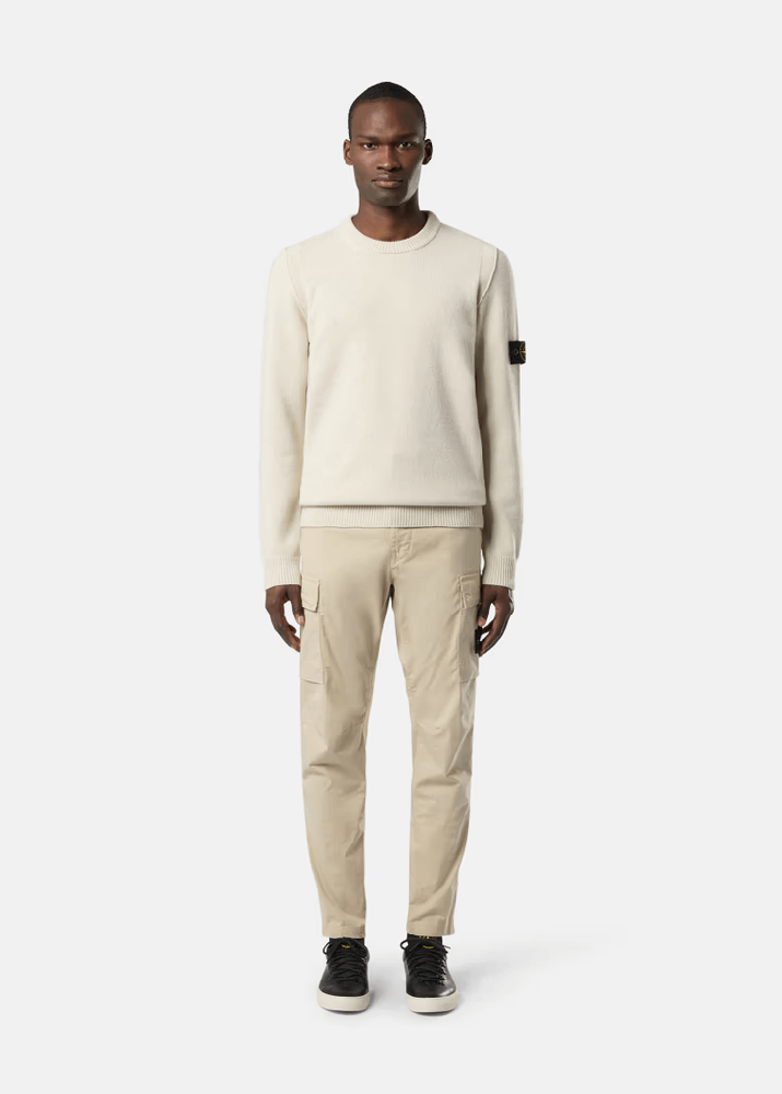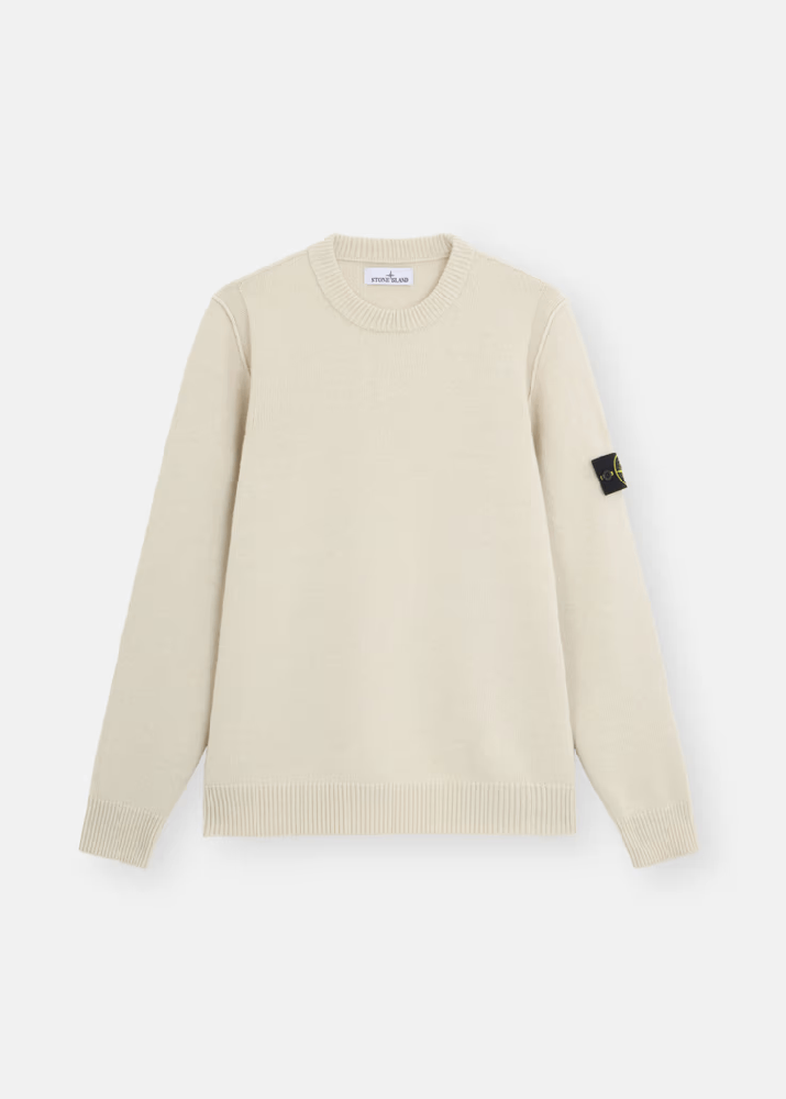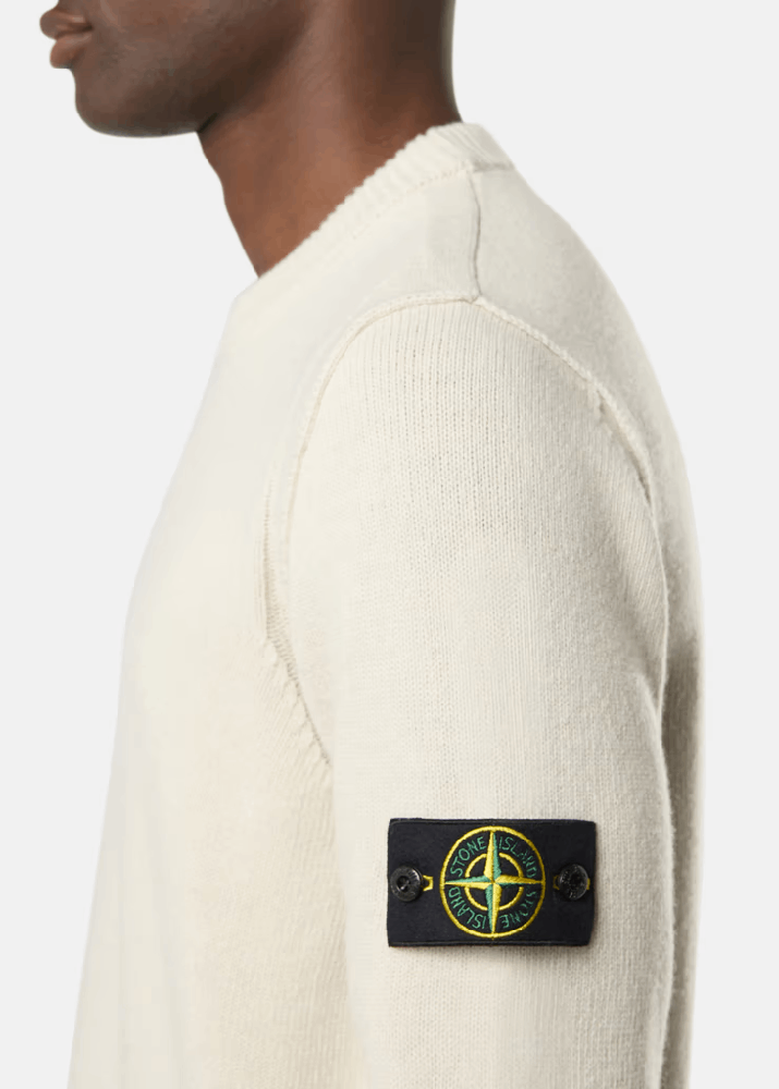 Maglione a girocollo in lambswool con scollo a coste, disegni a fascia a maglia rasata rovesciata e cuciture in rilievo. Finezza 7.