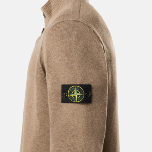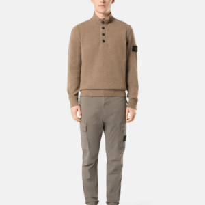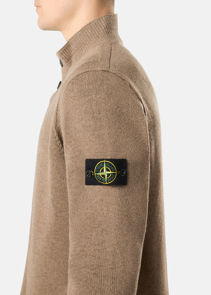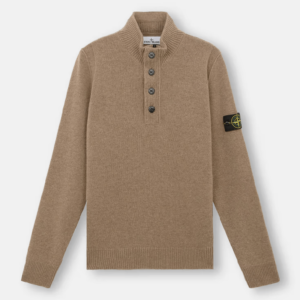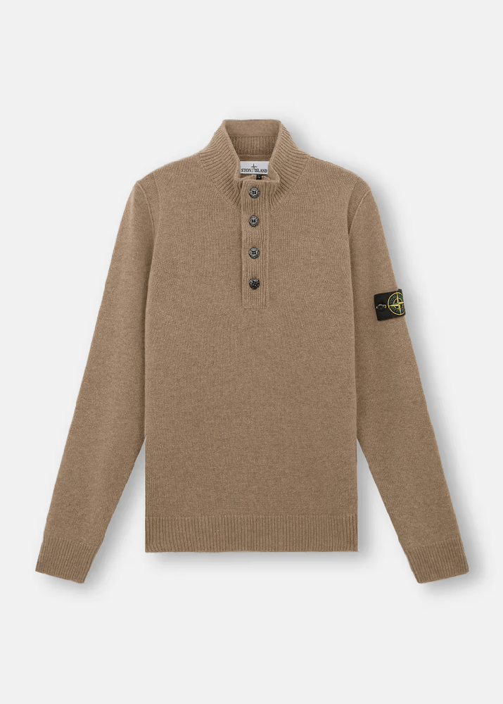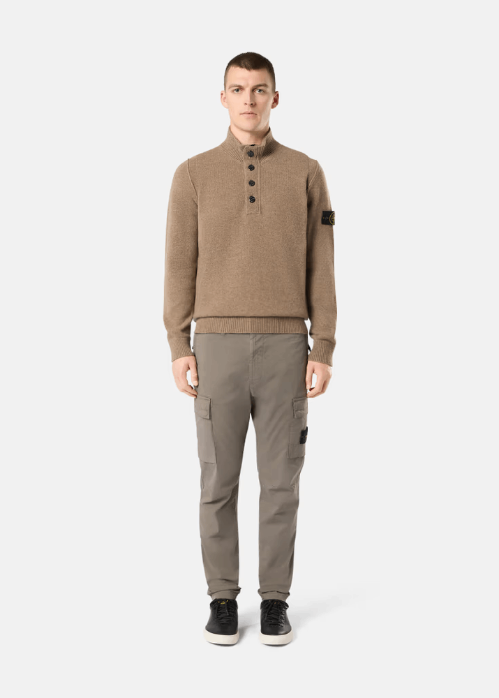 Maglione half zip con colletto rigido e bottoni sul collo, bande in maglia rasata rovesciata e cuciture in rilievo. Finezza 7.